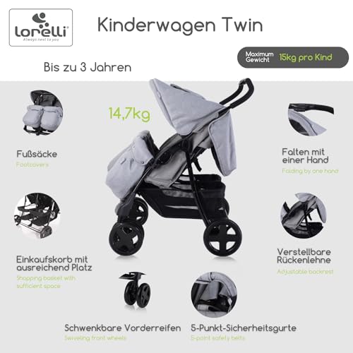 Lorelli-Zwillingskinderwagen-Twin-Zwillingsbuggy-klappbar-fuer-2-Kinder-leicht-kompakter-Zwillingswagen-Geschwister-Kinderwagen-mit-Einhand-Klappsystem-grau